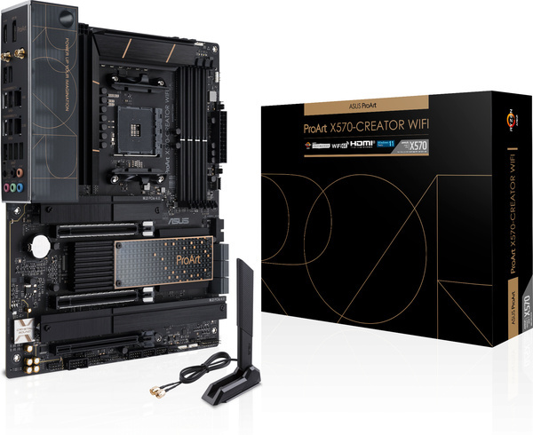 De ProArt X570-Creator WiFi is een moederbord bedoeld voor creatieve professionals. Dankzij groter uitgevoerde heatsinks is de koeling van chipset en de 14+2-fasige stroomvoorziening volledig passief. Dit is stiller en zorgt voor minder bewegende onderdelen, wat de betrouwbaarheid moet verhogen. Connectiviteit bestaat uit Ethernet in 10 en 2,5Gbit-varianten, wifi 6E, Thunderbolt 4 en vijfmaal usb 3.2 gen 2. Deze kunnen beveiligd worden met een managementfunctie in het Asus Control Center Express. Verder zijn er nog drie pcie 4.0 m.2-sloten voor het aansluiten van snelle solid state drives.