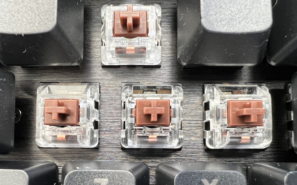 De SE is de tweede editie van de G413. Dat is onder andere te zien aan de keuze voor de switches. Waar de vorige editie Romer G-switches had, is hier gekozen voor Longhua Brown-switches met een actuatie op 1.9mm. Deze switches zijn een beetje een allemansvriend, met een voor mechanische toetsenborden relatief stille aanslag. Dat kan een voordeel zijn als je het toetsenbord gebruikt in een omgeving waarin ook anderen werken. De aanslag blijkt in de praktijk relatief zacht, als je hem vergelijkt met die van een toetsenbord met bijvoorbeeld Red-switches. De toetsen hebben 50 gram druk nodig. Dat lijkt best veel, al valt het wel mee als je een ‘harde tikker’ bent.