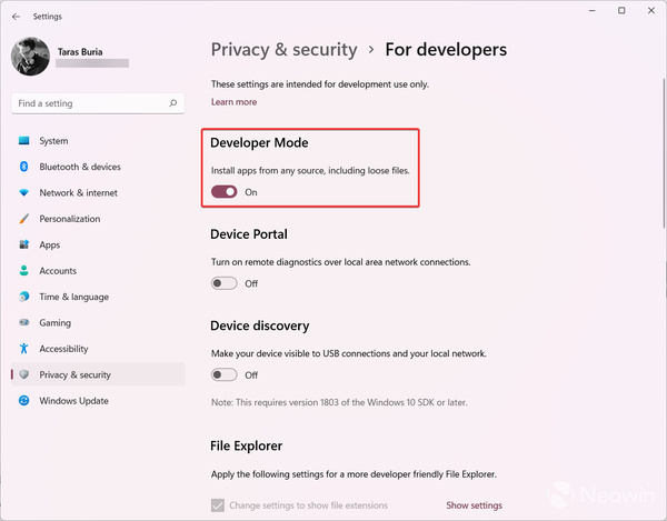 Kopiëer de bestanden product, system, system_ext, en vendor vanuit #Images naar de WindowsSubsystemAndroid-map. In de map Tools moet het bestand kernel hernoemd worden naar kernel_bak. Kopiëer het bestand kernel_x64_64 uit de map misc in GAppsWSA naar diezelfde Tools-map en hernoem deze naar kernel. Ga in de Instellingen naar Privacy en Beveiliging en ga naar het tabblad voor ontwikkelaars. Schakel de developers-modus in en open de Terminal met administratorrechten door er met de rechter muisknop op te klikken.