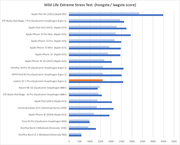 | Wild Life Extreme Stress Test | Apple iPhone SE (2020) (Apple A13) | realme GT 2 Pro (Qualcomm SnapDragon 8 gen 1) | OnePlus 10 Pro 5G (Qualcomm SnapDragon 8 gen 1) | Samsung Galaxy S22+ (Samsung Exynos 2200) | OPPO Find X5 Pro (Qualcomm SnapDragon 8 gen 1) | Apple iPad (2021) (Apple A13) | OnePlus Nord 2 (Mediatek Dimensity 1200) | Apple iPad Air (2022) (Apple M1) | Apple iPhone 13 Pro Max (Apple A15) | Apple iPhone 13 (Apple A15) | Apple iPhone 13 Mini (Apple A15) | Apple iPhone SE 5G (2022) (Apple A15) | Apple iPad mini (2021) (Apple A15) | Apple iPhone 13 Pro (Apple A15) | ZTE Nubia Red Magic 6S Pro (Qualcomm Snapdragon 888+) | ZTE Nubia Red Magic 7 Pro (Qualcomm SnapDragon 8 gen 1) | Poco X3 Pro (Qualcomm SnapDragon 860) | Xiaomi Mi 11i (Qualcomm SnapDragon 888) | OnePlus Nord CE 2 (Mediatek Dimensity 900 ) | OnePlus Nord 2T (MediaTek Dimensity 1300 |