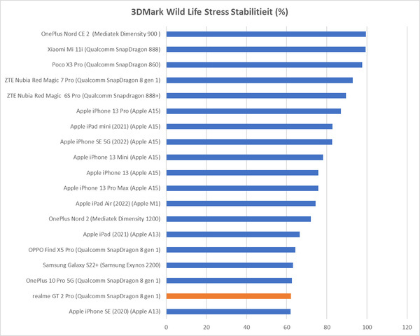 | Wild Life Extreme Stress Test | OnePlus Nord CE 2 (Mediatek Dimensity 900) | OnePlus Nord 2 (Mediatek Dimensity 1200) | Poco X3 Pro (Qualcomm SnapDragon 860) | Apple iPhone SE (2020) (Apple A13) | Samsung Galaxy S22+ (Samsung Exynos 2200) | Apple iPad (2021) (Apple A13) | ZTE Nubia Red Magic 6S Pro (Qualcomm Snapdragon 888+) | Xiaomi Mi 11i (Qualcomm Snapdragon 888+) | realme GT 2 Pro (Qualcomm SnapDragon 8 gen 1) | OPPO Find X5 Pro (Qualcomm SnapDragon 8 gen 1) | OnePlus 10 Pro 5G (Qualcomm SnapDragon 8 gen 1) | Apple iPhone SE 5G (2022) (Apple A15) | Apple iPhone 13 (Apple A15) | Apple iPhone 13 Mini (Apple A15) | Apple iPhone 13 Pro (Apple A15) | Apple iPhone 13 Pro Max (Apple A15) | Apple iPad mini (2021) (Apple A15) | ZTE Nubia Red Magic 7 Pro (Qualcomm SnapDragon 8 gen 1) | Apple iPad Air (2022) (Apple M1) | OnePlus Nord 2T (MediaTek Dimensity 1300 |