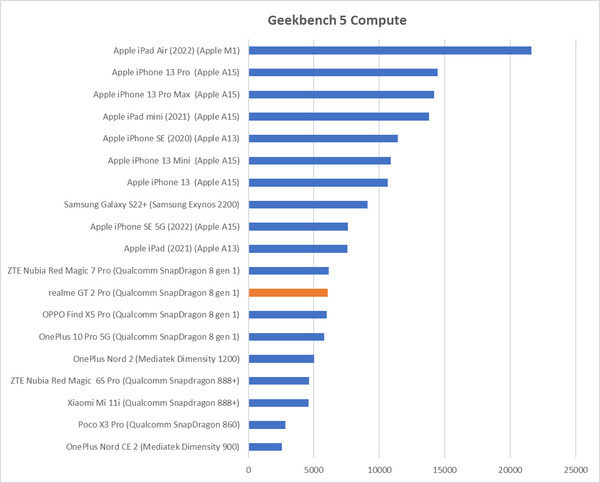 | Merk/ Model | Poco X3 Pro (Qualcomm SnapDragon 860) | Xiaomi Mi 11i (Qualcomm Snapdragon 888+) | ZTE Nubia Red Magic 6S Pro (Qualcomm Snapdragon 888+) | OnePlus Nord 2T | OnePlus Nord 2 (Mediatek Dimensity 1200) | OnePlus 10 Pro 5G (Qualcomm SnapDragon 8 gen 1) | OPPO Find X5 Pro (Qualcomm SnapDragon 8 gen 1) | realme GT 2 Pro (Qualcomm SnapDragon 8 gen 1) | ZTE Nubia Red Magic 7 Pro (Qualcomm SnapDragon 8 gen 1) | Apple iPad (2021) (Apple A13) | Apple iPhone SE 5G (2022) (Apple A15) | Samsung Galaxy S22+ (Samsung Exynos 2200) | Apple iPhone 13 (Apple A15) | Apple iPhone 13 Mini (Apple A15) | Apple iPhone SE (2020) (Apple A13) | Apple iPad mini (2021) (Apple A15) | Apple iPhone 13 Pro Max (Apple A15) | Apple iPhone 13 Pro (Apple A15) | Apple iPad Air (2022) (Apple M1) |