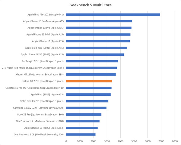 | OnePlus Nord 2 CE (Mediatek Dimensity 900) | Apple iPhone SE (2020) (Apple A13) | OnePlus Nord 2 (Mediatek Dimensity 1200) | Poco X3 Pro (Qualcomm SnapDragon 860) | Samsung Galaxy S22+ (Samsung Exynos 2200) | OPPO Find X5 Pro (SnapDragon 8 gen 1) | Apple iPad (2021) (Apple A13) | OnePlus 10 Pro 5G (Qualcomm SnapDragon 8 gen 1 | realme GT 2 Pro (SnapDragon 8 gen 1) | Xiaomi Mi 11i (Qualcomm Snapdragon 888) | ZTE Nubia Red Magic 6S (Qualcomm SnapDragon 888+ ) | RedMagic 7 Pro (SnapDragon 8 gen 1) | Apple iPhone SE 5G (2022) (Apple A15) | Apple iPad mini (2021) (Apple A15) | Apple iPhone 13 (Apple A15) | Apple iPhone 13 Mini (Apple A15) | Apple iPhone 13 Pro (Apple A15) | Apple iPhone 13 Pro Max (Apple A15 | Apple iPad Air (2022) (Apple M1) |