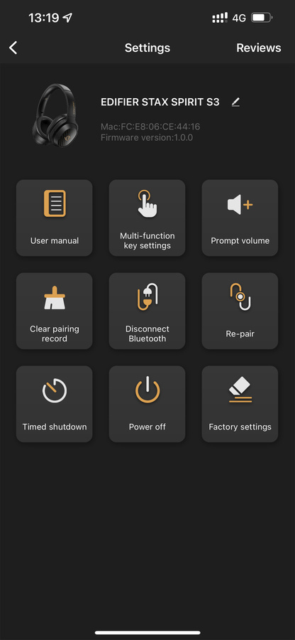 De Edifier Connect-app wordt gebruikt om de hoofdtelefoon op je iOS- of Android-telefoon te beheren. De functionaliteit van de app is redelijk. Je kunt kiezen tussen vier modi: Classic, HiFi, Stax en gaming; een losse equalizer hebben we helaas niet kunnen vinden. Handig is dat er een extra instellingenmenu is waarmee je onder andere de lijst met gekoppelde apparaten kunt deleten.