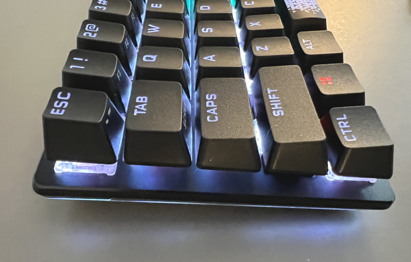 Corsair heeft aan de K70 Pro Mini een fikse prijskaart gehangen; je koopt hem voor ongeveer 190 euro. Voor dat geld krijg je een tikplank op basis van de MX-switches van Cherry. Standaard wordt gekozen voor de Red-switches van dat merk. Dat is geen beperking, want je kunt ze vervangen door een andere variant. Daarbij ben je niet beperkt door de positie. Wil je alleen andere switches voor de WASD-knoppen of een andere klik op je Enter, dan is dat geen probleem. De Red-switches zijn lineair en hebben een pre-travel van 2mm; de totale travel is 4mm.