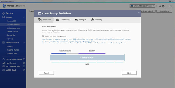 Net als andere nas-fabrikanten biedt QNAP de mogelijkheid om op verschillende manieren de capaciteit van harde schijven te verdelen. Je begint met het aanmaken van een storage pool waarin een of meerdere schijven zijn opgenomen. Daarin maak je vervolgens een of meerdere volumes aan. Die kunnen verschillende eigenschappen hebben: je kunt ze dynamisch laten groeien of direct een bepaalde capaciteit geven.