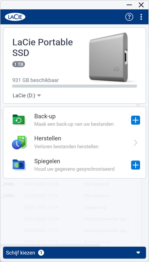 De LaCie Portable SSD wordt geleverd met software voor Windows en Mac. Gezien de doelgroep is het opvallend dat het merk nog geen software voor de iPad beschikbaar heeft gesteld. De toolkit lijkt op de software die Seagate meelevert.
