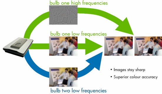 De werking van een scanner is in de basis vrij simpel. Een lamp - meestal van het type CCFL - verlicht het te scannen object en met behulp van een sensor worden op iedere te scannen positie een drietal samples genomen voor Rood, Blauw en Groen. Op basis van die drie samples wordt de uiteindelijke kleur bepaald. Bij de nieuwe scanners gaat HP voor het eerst een stapje verder. Men gebruikt twee lampen met een in totaal veel groter kleurenspectrum en de scanner is in staat een zestal samples te nemen, ofwel nog drie extra samples buiten Rood, Groen en Blauw. Op basis van deze zes samples wordt dan de uiteindelijke kleur van alle pixels bepaald. Zeker bij bepaalde kleuren die duidelijk anders zijn dan rood, groen of blauw, kan een 6-kleuren scan tot mooiere resultaten leiden. HP claimt met de nieuwe scanners een onovertroffen kleurnauwkeurigheid te kunnen bieden en hoewel we in ons testlab helaas niet over de middelen beschikken om die kleurnauwkeurigheid exact in kaart te brengen, moeten we absoluut concluderen dat de kleuren van de door ons gescande test foto's en dia's werkelijk uitstekend zijn. Toch is het verschil tussen een drie en zeskleuren scan slechts marginaal en in de meeste gevallen met het blote oog zelfs totaal niet te zien. Het echte voordeel komt pas naar voren als je de extra mogelijkheden van de scanner gaat benutten. Bijvoorbeeld wanneer je de optie inschakelt om vervaagde kleuren van oude foto's terug te halen, zal de scanner goed gebruik kunnen maken van de extra kleurinformatie. Geen wonder dat de resultaten hierbij een stuk beter zijn dan wat je met software voor elkaar zou kunnen krijgen.