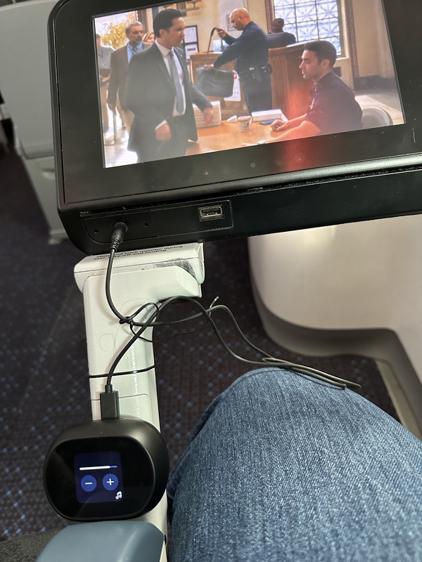 Het doosje van de Free 60+ UC heeft nog een extra functie: je kunt het gebruiken als bluetooth-zender. Daarmee kun je apparaten die geen bluetooth hebben toch aan de oortjes koppelen. Een voorbeeld hiervan is het entertainmentsysteem dat je in vliegtuigen aantreft. In de doos vind je een speciaal usb-naar-audiojack-kabeltje waarmee je deze koppeling kunt realiseren. Helaas levert Poly geen draagtasje mee waarin je dit speciale kabeltje zou kunnen opbergen om te voorkomen dat je het kwijtraakt. De oortjes werken prima in combinatie met het entertainmentsysteem van KLM, blijkt uit onze praktijktest. Een nadeel is alleen wel dat het geluid bij een film niet altijd synchroon loopt met de spraak. Dat kan vervelend zijn.