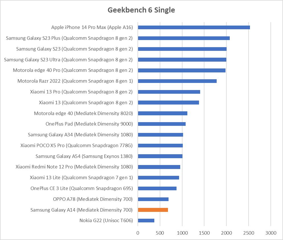 | Samsung Galaxy A14 (MediaTek Dimensity 700) | 680 |