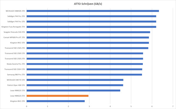 De NM620 laadt de PCI Express 3.0-bus netjes vol. De prestaties zijn opvallend genoeg iets minder goed dan die van de 1TB-variant. De ssd overtreft echter wel de Kingston NV2 die over PCI Express 4.0 beschikt.