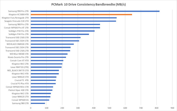 Bij urenlange zware belasting laat de KC3000 een zeer goed resultaat zijn. Deze ssd is en blijft pijlsnel.