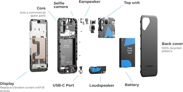 Fairphone heeft in het toestel een QM6490 van Qualcomm ingebouwd. Dat is een soc die ook wordt gebruikt in professionele toepassingen zoals handterminals. Dergelijke producten worden vaak langer in gebruik gehouden dan smartphones en moeten dus ook langer worden ondersteund door hun fabrikanten. Het gevolg daarvan is dat Fairphone je een superlange ondersteuning kan bieden. Om te beginnen geeft het bedrijf maar liefst vijf jaar fabrieksgarantie. Verder is het van plan om minstens acht jaar software-ondersteuning te bieden, maar het mikt eigenlijk op tien jaar. Ook biedt Fairphone ondersteuning voor het geval dat je een ander OS op de telefoon zou willen installeren.