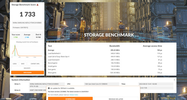 We hebben ook de ssd van het systeem getest. De PM9A1 is een oem-model van Samsung. Hieronder zie je de resultaten in een aantal benchmarks. Voor wie echt de beste prestaties wenst, zou de upgrade naar een betere ssd kunnen lonen.