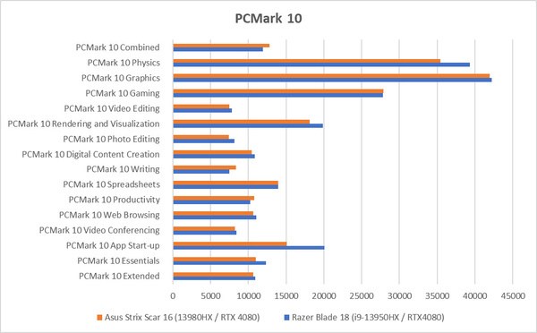 We vergelijken de Strix Scar 16 met een Razer Blade 18. Dat model heeft dezelfde gpu, maar in plaats van een 13980HX is een 13950HX ingebouwd. De twee zijn in PCMark 10 grofweg even snel, al lopen de resultaten in de verschillende onderdelen uiteen.