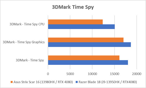In Time Spy is de Razer Blade eveneens sneller dan de Asus Strix Scar.