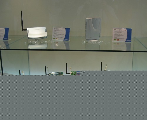 Een andere productgroep waar Gigabyte op de beurs veel aandacht aan besteedde is network-toebehoren. Zoals op onderstaande foto's te zien heeft Gigabyte inmiddels een enorm assortiment aan wireless-netwerk producten. Nieuwe 'Easy Setup III' software moet het zelfs voor mensen met vrijwel geen computerervaring mogelijk maken om een draadloos netwerk te installeren en te beveiligen. Helaas voor de Nederlandse beginnende PC-gebruikers zal die software er echter niet in onze eigen taal komen.