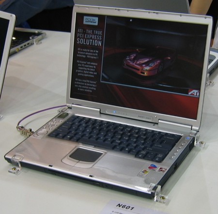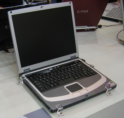 Als laatste toonde men ook een groot aantal nieuwe laptops op de beurs. Goed nieuws is dat de nieuwe laptops van Gigabyte een stuk 'Europeser' uiterlijk hebben dan de voorgaande reeksen. Onderstaande nieuwe entry-level Centrino laptop vind ik persoon zeer strak vormgegeven. Onderaan de pagina vind je een nieuwe high-end alles-erop-en-eraan notebook van Gigabyte, eveneens gebaseerd op Centrino technologie.