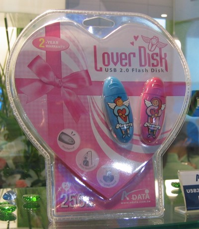 Op de stand van A-Data vonden we verder ook nog een flink assortiment USB geheugensticks, waarbij de volgende twee toch wel het meest in het oog sprongen. Ideaal valentijnsdag cadeau voor koppels die elkaar via internet hebben leren kennen?