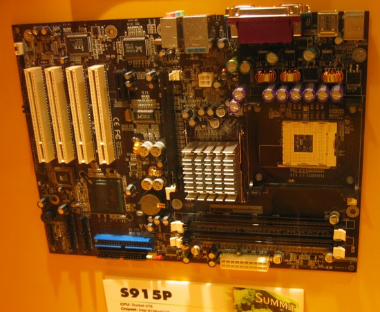 In de Summit reeks zagen we ook nog een aantal interessante moederborden. Allereerst de S865PE2, een Socket 775 moederbord met Intel 865PE chipset. Zondermeer een zinnig product, want zoals we ook al eerder bij AOpen hoorde, is de verwachting dat Socket 775 processor eerder populair zullen worden dan PCI-Express videokaarten. De S915P is precies het tegenovergestelde: dit is een Socket 754 moederbord met Intel 915 chipset. Of iemand een 'ouderwetse' Socket 478 processor nog wil combineren met een moderne PCI-Express videokaart betwijfel ik ten zeerste. De SPT890 gaat gebruik maken van de VIA PT890 chipset, zoals je in het verslag van Computex Dag 1 kon lezen de enige Pentium 4 chipset met ondersteuning voor zowel AGP als PCI-Express. Het is alleen nog even wachten eer VIA de chipset helemaal klaar heeft.