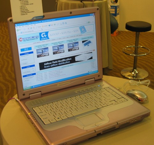 Als laatste dan nog de Chaintech notebooks die geen notebook zijn. Wat je ziet op onderstaande foto is eigenlijk een soort mini-PC in een notebook-achtige behuizing. Binnenin worden normale desktop componenten gebruikt, zoals desktop CPU's, standaard 184-pins DIMM's en een 3,5" harddisk. Een accu is niet aanwezig en indien gewenst kan het systeem zelfs zonder scherm geleverd worden. Chaintech gaat de machines als barebones leveren en wil in ieder land één partij die de draagbare mini-PC's als volledig geassembleerd product op de markt gaan brengen. ECS heeft hetzelfde idee overigens al eens gehad met de DeskNote machine. Dat is overigens nooit een succes geworden.
