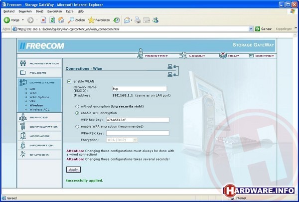 Van Freecom ontvingen we ook de Freecom Storage Gateway WLAN. Dit is een bijzonder apparaat, want dit is behalve een NAS ook een draadloze router. Een echte alles-in-één oplossing die, zeker in combinatie met een 500 GB harde schijf, zijn nut kan bewijzen. De router biedt vier 100 Mbit netwerkaansluitingen en voor de draadloze verbindingen is een 802.11g WLAN-interface beschikbaar. Compleet, maar mocht het niet voldoende zijn, dan kun je via USB nog vier apparaten aansluiten en voor nog meer opslag is er zelfs nog een eSATA-aansluiting aanwezig. Hoewel deze moderne aansluiting op het kastje aanwezig is, heeft Freecom nog voor een PATA harde schijf gekozen: een 500 GB grote Hitachi.