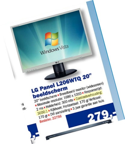 Ook voor wat betreft het contrast is er geen uniforme methode waarop dit wordt aangegeven. Fabrikanten goochelen tegenwoordig met ‘dynamisch contrast', waarbij de backlight teruggeregeld wordt en komen zodoende met absurde claims oplopend tot 3000:1. In dat geval zou het wit in het beeld dus een factor drieduizend helderder zijn dan het zwart, een dynamisch bereik dat met LCD-technologie absoluut niet haalbaar is. Daar komt bij dat het menselijk oog een dergelijke hoog contrast niet eens zou kunnen verwerken en details in donkere delen van het beeld niet zou waarnemen. Voor deze test meten we het contrast op twee manieren: Full on-off, dat wil zeggen een meting van een volledig wit en een volledig zwart scherm, en een meting waarbij het beeld nooit helemaal zwart is maar - buiten het gebied dan de sensor daadwerkelijk meet - gewoon wit blijft. Bij die tweede methode krijg je een veel beter beeld van hoe een scherm in de praktijk scoort, en zien we waardes die rond 200:1 liggen. In de vergelijkingstabel bij dit artikel (klik op Specificaties vergelijken in het productoverzicht onderin) vind je dan ook naast de opgegeven waardes, ook onze eigen meetwaarden.