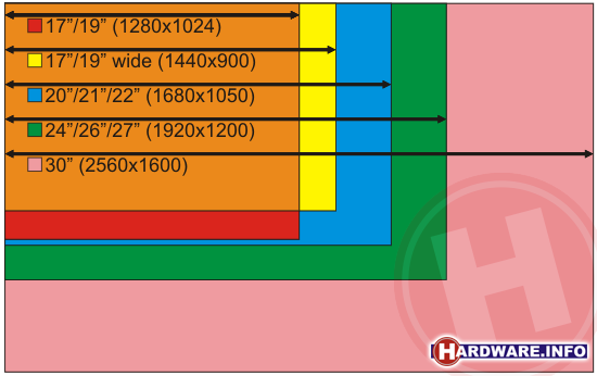 TFT-schermen hebben een vaste resolutie en dus betekent dat je keuze qua beelddiagonaal ook meteen een keuze is voor hoeveel informatie je daadwerkelijk op het scherm krijgt. Bij 20", 21" en 22" monitoren bedraagt de vaste resolutie 1680x1050 pixels. Dat is heel wat meer dan de 1440x900 pixels die 17" en 19" breedbeeldmonitoren kunnen weergeven. Let wel, 20" en 22" TFT's hebben dus exact dezelfde resolutie: kies je tussen deze twee formaten, dan krijg je in het tweede geval alleen groter beeld, maar dus zeker niet meer beeld. Pas wanneer je gaat kijken naar een 24" , 26"of 27" scherm, dan wordt er weer een stap in resolutie gemaakt. Deze schermen bieden 1920x1200 pixels. Het fijne van deze monitoren is dat ze scherp genoeg zijn om Full HD-video op volledige resolutie te tonen.