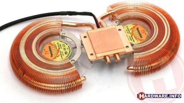 Thermaltake is één van de pioniers in het gebruik van vinkoelers. Ook de vrijwel geheel uit aluminium opgetrokken DuOrb voor grafische kaarten maakt gebruik van het vin-principe, waarbij een koperen koelbok als het midden van een acht staat tussen twee gebogen heatpipes met vinnen en ventilatoren. Het resultaat is een fraai ogende koeler. De koelprestaties vallen ons helaas wat tegen: de DuOrb bevindt zich steeds rond of onder het gemiddelde, terwijl het geluidsniveau met 44,4 dB ook niet bepaald laag is. We concluderen dan ook dat de DuOrb weliswaar een fraaie koeler is die in een casemod zeker niet zal misstaan, maar dat het geen hardloper is qua prestaties.