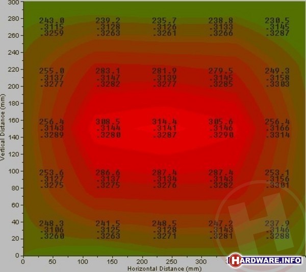 Eén van de traditionele minpunten van LCD-monitoren is de matige kijkhoek van het beeld; alleen wanneer je er recht voor zit, ziet het beeld erg écht goed uit. Fabrikanten geven in hun specificatielijsten aan hoe groot de kijkhoek zou moeten zijn, en claimen daarbij waarden die uiteenlopen van 135 procent tot 178 procent. Hierbij wordt vaak uitgegaan van het punt waarop het contrast nog 5:1 of 10:1 is als kritiek punt. Een contrast van 5:1 of 10:1 levert in de praktijk echter geen werkbare situatie op, en voor onze nieuwe testmethode pakken wij het anders aan: we meten de helderheid van de monitor zowel recht van voren, als onder een hoek van 45 graden van boven, onder en opzij. Vervolgens geven we in onze tabel aan hoeveel procent van de originele helderheid er onder die hoek nog overblijft. 45 graden is immer een realistische hoek waaronder een monitor eigenlijk nog een goed en helder beeld zou moeten geven. In onze tabel kun je echter zien dat dat zeker niet altijd het geval is. Horizontaal is de kijkhoek naar beide kanten gelijk, en blijft bovendien nog redelijk goed. Door de manier waarop LCD-panelen gefabriceerd worden verschilt de kijkhoek van boven gezien ten opzichte van de onderkant. Vooral monitoren met een TN-paneel scoren zeer slecht als het om verticale kijkhoek gaat, vooral van onderen. Tip is dan ook om er altijd voor te zorgen dat je de monitor zo opstelt of kantelt, dat je vertikaal onder een hoek van 90 graden naar het scherm kijkt.