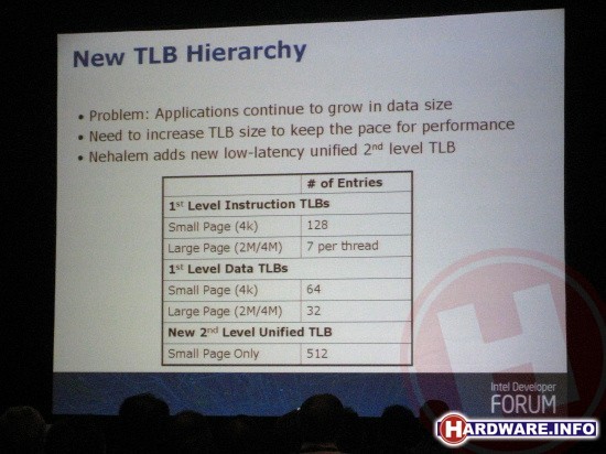 Ook op het vlak van geheugenmanagement zijn er flinke verbeteringen. Een enigszins verborgen verbetering ten opzichte van Penryn die we kunnen zien in het blokschema van pagina 2 is een tweede TLB (Translation Lookaside Buffer). Zo'n TLB wordt gebruikt om eenvoudig een omrekening te kunnen maken tussen de geheugenadressen waar een programma mee werkt, naar daadwerkelijk fysieke adressen in het RAM-geheugen van de PC. Immers, een programma krijgt door het besturingssysteem gewoon een bepaalde hoeveelheid geheugen toegewezen, zeg 512 MB, waarbij het verder vanuit het programma niet duidelijk is (en ook niet nodig om te weten is) waar deze data zich daadwerkelijk bevindt op de geheugenmodules. De processor moet dus telkens als een programma een bepaald stuk geheugen opvraagt, berekenen op welk fysiek geheugenadres de data te vinden is. De TLB is, zoals de naam al aangeeft, een buffer waarin veelgebruikte geheugenadressen direct op te zoeken zijn.