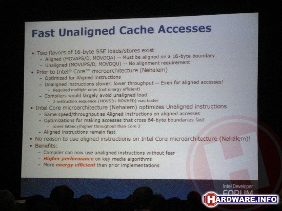 Wanneer de compiler 100% zeker weet dat dit bij een bepaalde operatie altijd het geval is, kan er gebruik gemaakt worden van aligned load-operaties. Wanneer die zekerheid er niet is, moet er worden gekozen voor de unaligned variant, die een stuk langer duurt en daarna implicaties heeft op de prestaties. Het frustrerende is, dat zelfs wanneer de data uiteindelijk toch in de juiste volgorde in het geheugen blijkt te staan, deze unaligned functies toch meer tijd in beslag nemen. Dát is bij Nehalem verleden tijd; het gebruik van unaligned instructie op data die toch aligned is, duurt exact even lang als wanneer er van een aligned instructie gebruik werd gemaakt. Deze potentiële bottleneck is dus helemaal weggenomen.