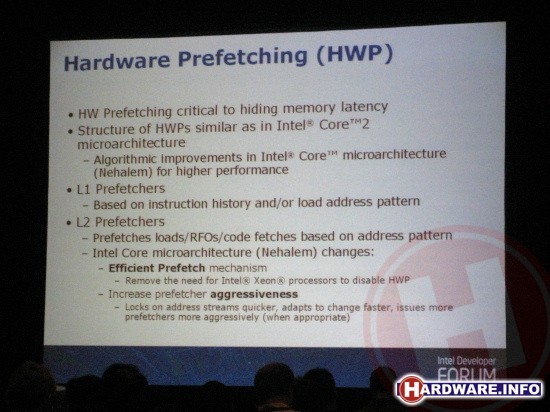 Ook hier heeft Intel wat op bedacht. De vernieuwde prefetchers in de Nehalem architectuur controleren de hele tijd hoe goed de resultaten zijn die ze afleveren. Wanneer blijkt dat ze bij een bepaalde programmathread telkens de mist in gaan, wordt de werking van de prefetchers op een lager pitje gezet. Ofwel; de prefetchers zijn zelfreguleren en zitten zich dus in feite uit wanneer ze slecht werk afleveren. Op die manier heb je wel altijd de kans op flinke prestatieverbeteringen, maar hoef je nooit bang te zijn dat de prestaties worden beperkt.