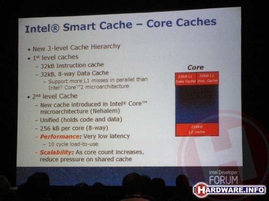 De Nehalem cores hebben elk 256 kB L2-cache die zeer snel te benaderen is. In de meeste gevallen bedraagt de toegangstijd zo'n 10 klokslagen.