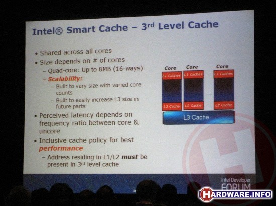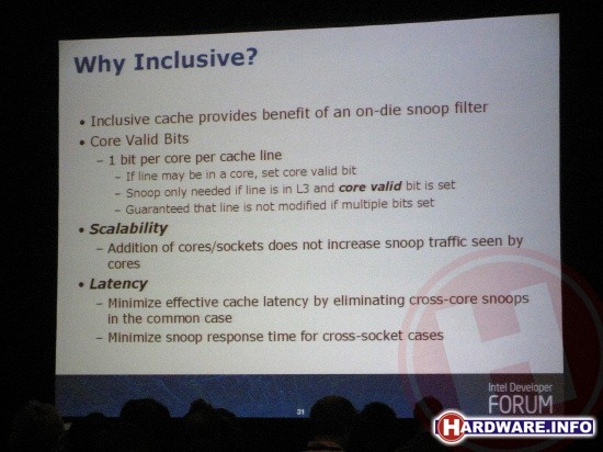 De L3-cache is zogenaamde inclusive, want betekent dat alle data die in de L1 en L2 cache staat, ook verplicht in de L3-cache aanwezig moet zijn. Dat lijkt op het eerste gezicht onlogisch, aangezien je daardoor in feite onder de streep minder cache capaciteit hebt. Toch is dat juist erg slim, aangezien je op die manier direct een snoop filter kado krijgt.