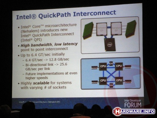 Een belangrijke eigenschap van de nieuwe Nehalem architectuur is natuurlijk de nieuwe processorbus. De QuickPath technologie is een snelle chip-naar-chip verbinding die veel weg heeft van AMD's HyperTransport. Het voordeel wordt vooral duidelijk bij systemen met twee of meer processors: de CPU's zijn dan niet meer allemaal afzonderlijk verbonden met de chipset, maar hebben juist direct verbindingen met elkaar, om op die manier zo snel mogelijk data uit te kunnen wisselen.