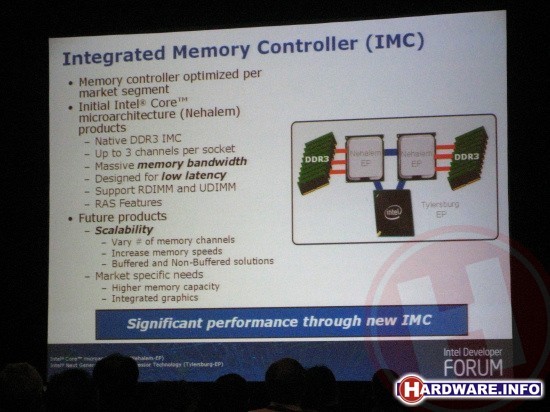 Een bijkomend aspect is de geïntegreerde geheugencontroller van Nehalem. Ook hier heeft Intel meer informatie over bekend gemaakt. We wisten al dat de eerste Nehalem chips die het levenslicht zullen zien, een triple-channel DDR3-geheugencontroller aan boord hebben. Doordat het geheugen rechtstreeks met de processor verbonden is, zijn de latencies veel lager dan bij huidige Intel platformen. Het hele concept van fully buffered DIMM's, zoals dat nu in Intel servers wordt toegepast, is overboord gegooid. Nehalem maakt voor desktop systemen gebruik van standaard DDR3-modules en voor servers van registered varianten.