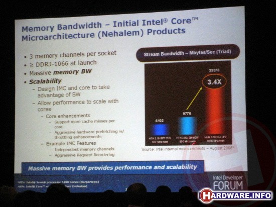 In dual-CPU configuraties is er in feite nu een zes-kanaals geheugencontroller aanwezig. Intels huidige chipset voor quad-core Xeon-processors uit de Core-generatie is beperkt tot vier kanalen. Samen met de lagere latencies en hogere doorvoersnelheid van DDR3, heeft dit een gigantische prestatiewinst op geheugenvlak voor het nieuwe platform tot gevolg. Zo toonde Intel de resultaten van de veel gebruikte Stream geheugen benchmark. Een bestaande state-of-the-art server met twee Harpertown Xeon processors met 1600 MHz FSB en quad-channel FBDIMM DDR2-800 geheugen behaalt in de benchmark net geen 10 Gigabyte per seconde doorvoersnelheid. Een server op basis van twee Nehalem processors met elk triple-channel geheugen gaat met gemakk de 33 Gigabyte per seconde voorbij. Een stijging van 3,4x! Voor server applicaties die goed schalen met geheugen snelheid (zoals bijvoorbeeld database applicaties) kan de overstap naar Nehalem dus zeer interessant zijn. In feite geeft Intel inmiddels dus ook schoorvoetend toe dat de geheugenarchitectuur die AMD al sinds de Athlon 64 heeft gekozen, de enige juiste is.
