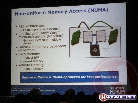 Hier kan Intel echter profiteren van de wet van de remmende voorsprong. AMD heeft met haar Opterons inmiddels immers al enkele jaren een NUMA geheugen architectuur, met als resultaat dat alle besturingssystemen (Windows, Linux, etc.) er al volledig voor zijn geoptmaliseerd. Intel profiteert daar nu direct van mee.