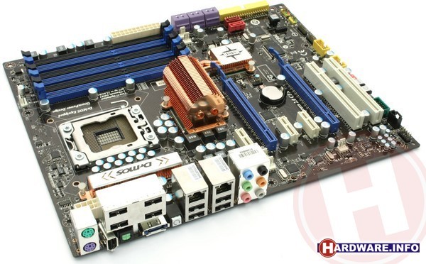 De MSI X58 Platinum is met een gemiddelde prijs van 258 euro een van de meest betaalbare moederborden uit de test. Je hoeft echter geen kaal bord te verwachten, in tegendeel! Ook bij MSI vinden we zes DDR3 geheugensloten. De X58 Platinum biedt ruimte aan twee videokaarten en daarnaast drie keer PCI-Express x1 en twee keer PCI. Op de northbridge vinden we een flink, volledig koperen koelblok dat zo is ontworpen dat het optimaal airflow kan opvangen. Op de south bridge zit een klein koelblokje dat via een heatpipe met de north bridge verbonden is.