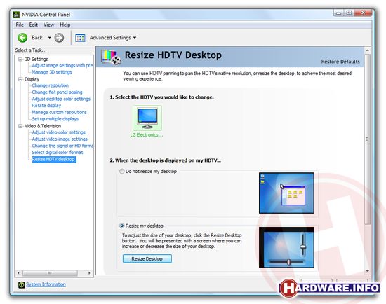Overscan compenseren is bij PC's met een geïntegreerde Intel videokaart helaas niet mogelijk. ATI en nVidia bieden de optie wel. Bij ATI vind je deze onder Opties schermgrootte. Je kunt het beeld hier van 0% tot 15% verkleinen. nVidia biedt de optie bij resize HDTV desktop. Wanneer je hier aangeeft dat de desktop afmeting moeten worden aangepast, krijg je op je scherm een tweetal sliders, waarmee de horizontale en verticale grootte kan worden aangepast.