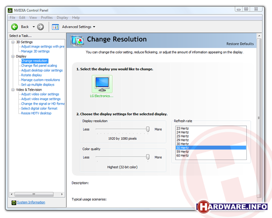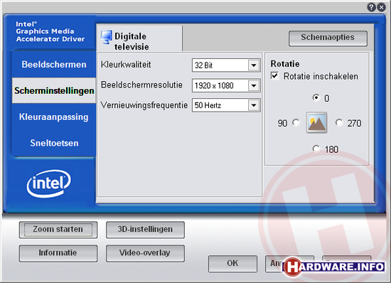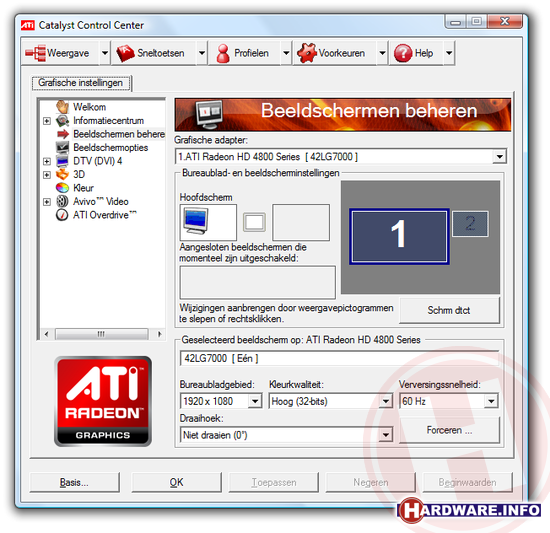 Het instellen van de juiste resolutie en refresh rate van bij ATI onder het kopje beeldschermen beheren, bij nVidia onder het kopje change resolution en bij Intel onder scherminstellingen. In alle gevallen kun je hier de keuze maken voor 50 Hz of 60 Hz. ATI en nVidia maken het je zelfs nog wat makkelijker; wanneer je bij ATI rechts onderin op de knop Forceren drukt, krijg je opties om kant en klare HD-resoluties in te stellen, waar 1920x1080x50Hz natuurlijk één van de opties is. De nVidia drivers bieden diezelfde optie onder het kopje change the signal or HD format. Hier kun je ondermeer kiezen voor 1080p50.