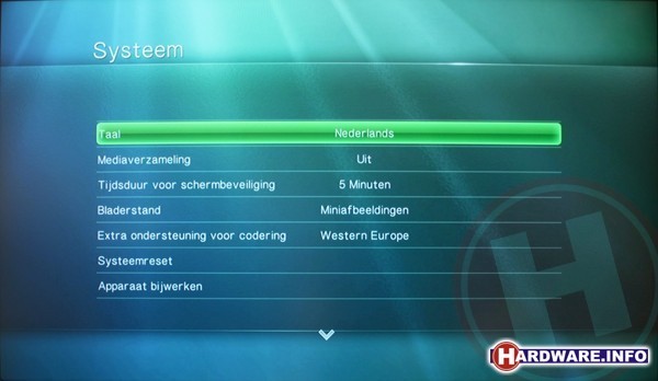 Het menu van de Eminent EM7075dts werkt zeer vergelijkbaar, alleen is het hoofdmenu horizontaal in plaats van verticaal georiënteerd. Ook zijn meer hoofdmenu-items in één keer zichtbaar, waardoor dit menu in de praktijk wat overzichtelijker is. De submenu's met folders en bestanden zijn zo goed als identiek qua aantallen getoonde folders en bestanden.