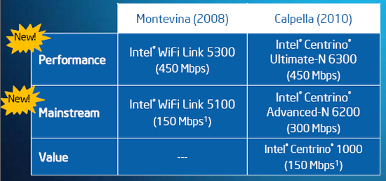 Voor de nieuwe Core i3, i5 en i7 notebooks heeft Intel een drietal Wireless modules beschikbaar. De snelste is de Centrino Ultimate-N 6300 en biedt een theoretische doorvoersnelheid van 450 Mbit/s. Het mainstream model heet Centrino Advanced-N 6200 en biedt een theoretische doorvoersnelheid van 300 Mbit/s. Een nieuwe instap wireless module luistert naar de naam Centrino 1000 en werkt op 150 Mbit/s.