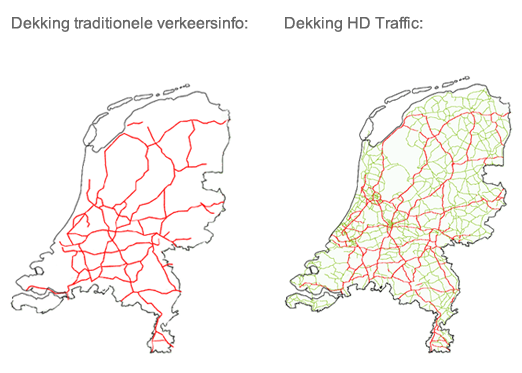 Op basis van de gegevens die de voor HD Traffic geschikte kastjes en de Vodafone GSM's opleveren, produceert TomTom zeer gedetailleerde verkeersinformatie die naar eigen zeggen alle snelwegen - inclusief alle op- en afritten - en het complete N-wegennet behelst. Onderstaande afbeelding afkomstig van de TomTom site toont het verschil in dekking tussen TMC en HD Traffic. Wie wil weten welke verkeersinformatie TomTom op dit moment te bieden heeft, kan terecht op deze link.