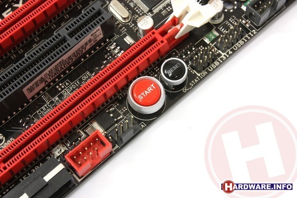Op het moederbord zijn verder uiteenlopende extra mogelijkheden te vinden. Allereerst mogen uiteraard de on-board power en reset knoppen niet ontbreken. Minstens net zo handig is de GO knop, die naast de ATX power connector te vinden is. Deze biedt je mogelijkheid om terwijl de PC draait met één druk op de knop een vooraf in de BIOS ingesteld overklok profiel in te stellen. Op die manier kun je een extreme overklok pas op het moment dat je gaat benchmarken laten in gaan en dus opstarten met veiligere settings.