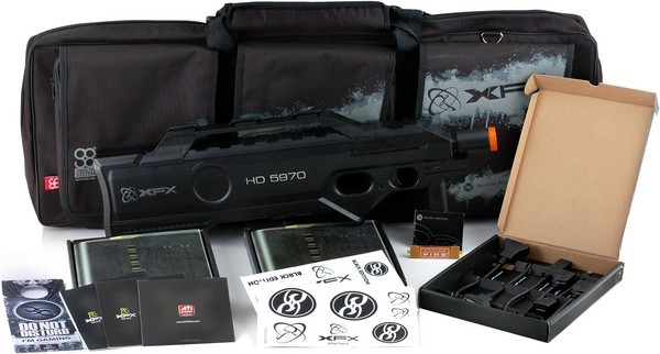 Twee pagina's terug schreven we al dat ASUS de Ares kaart in een gigantische doos uitlevert. Het record voor grootste videokaartdoos ooit heeft ASUS echter slechts kort van kunnen genieten. De doos van de XFX Black Edition is va het formaat dat een gemiddelde dakloze er bij wijze van spreken jaloers op is! In die doos vinden we een soort weekendtas met daarin allerhande accessoires, maar bovenal een replica P90-geweer, waar uiteindelijk de kaart in verstopt zit. Kijk, dát is nog eens een videokaart in stijl verpakken!