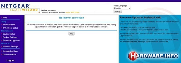 De Netgear WNCE2001 is dus op meerdere manieren te verbinden met het draadloze netwerk, via WPS, maar ook via het menu. Als de wifi-adapter via een netwerkkabel aangesloten is op een computer is het apparaatje te benaderen door naar mywifiextender.net te navigeren. Het openingscherm van de Netgear is een automatische firmware update check. Dat is een functionaliteit die we kennen van de Netgear routers.