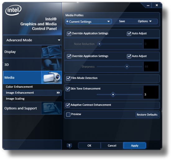 De drivers van Intel HD Graphics bieden wat minder instellingsmogelijkheden. Onder het kopje Media vind je alles wat met video te maken heeft. Bij Color Enhancement kun je basis kleuraanpassingen doen, zoals helderheid en contrast. Bij Image Enhancement kun je de ruis onderdrukking (Noise Reduction) en verscherping (Sharpness) instellen. De Auto Adjust opties werken wat ons betreft prima. Zet ook bij nVidia het schuifje voor verscherping niet te ver naar rechts, want de videobeelden zien er dan echt niet meer uit. Bij Advanced Deinterlacing moet je Film Mode Detection absoluut aanvinken. Alleen dan wordt 2:2 en 3:2 pulldown goed toegepast. Bij Image Scaling ten slotte kun je ervoor zorgen dat video altijd wordt afgeknipt zodat deze beeldvullend wordt. Zo wordt bij 2.35:1 films links en rechts wat weggehaald om de film mooi op een 16:9 TV te plaatsen. Filmpuristen bibberen al bij de gedachte hieraan… Bij de nieuwe HD Graphics 2000/3000 krijg je extra mogelijkheden, waaronder dynamisch contrast en huid tonen correctie.