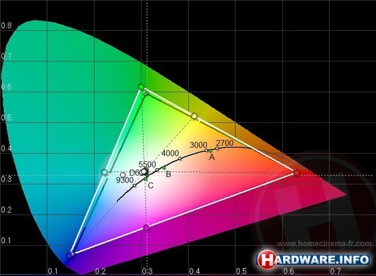 Om de kleurweergave van televisies te meten, gebruikt Hardware.Info een zogenaamde colorimeter, waarmee nauwkeurig is vast te stellen of het kleurbereik van televisies overeenkomt met de PAL en HDTV normen en in hoeverre hier afwijkingen in zitten. Van elke geteste televisie vind je op de site onderstaand CIE diagram terug. In de vorm van een driehoek met de hoekpunten rood, groen en blauw laat deze het kleurbereik van de televisie in kwestie zien. De donkergrijze driehoek geeft hierbij de gewenste kleurruimte volgens de HDTV norm aan, de witte driehoek de daadwerkelijk gemeten waarden. In het voorbeeld van afbeelding 2 zien we dat het kleurbereik voor rood vrijwel perfect is, terwijl de TV met name bij groen een te groot kleurbereik heeft en niet gelijk valt met de zwarte driehoek die de HDTV kleurruimte voorschrijft.